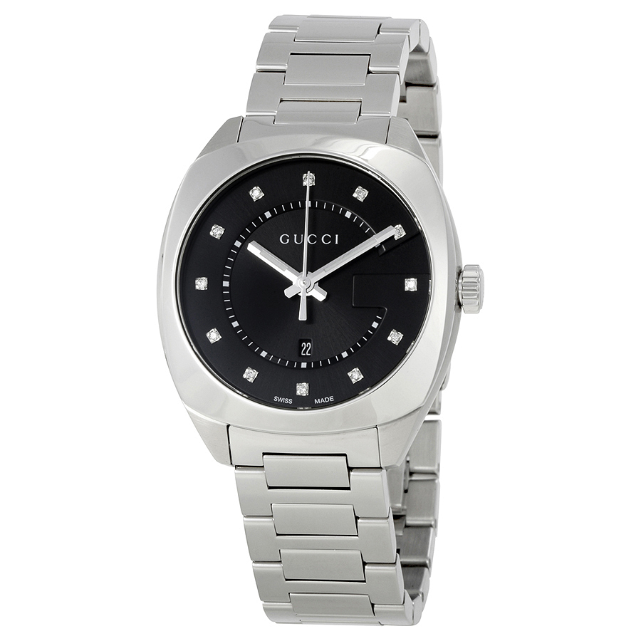 Stainless steel case with a stainless steel bracelet. Fixed stainless steel bezel. Black dial with luminous fill silver-tone hands and diamond hour markers. Minute markers around an inner ring. Dial Type: Analog. Luminescent hands. Date display at the 6 o'clock position. Quartz movement. Scratch resistant sapphire crystal. Screw down crown. Solid case back. Case size: 37 mm. Case thickness: 9 mm. Round case shape. Bracelet width: 18 mm. Deployment clasp with a push button release. Water resistant at 50 meters / 165 feet. Functions: date, hour, minute, second. Additional Info: in general, suitable for short periods of recreational swimming, but not diving or snorkeling. Casual watch style. Watch label: Swiss Made. Gucci GG2570 Black Dial Diamond Ladies Watch YA142404.