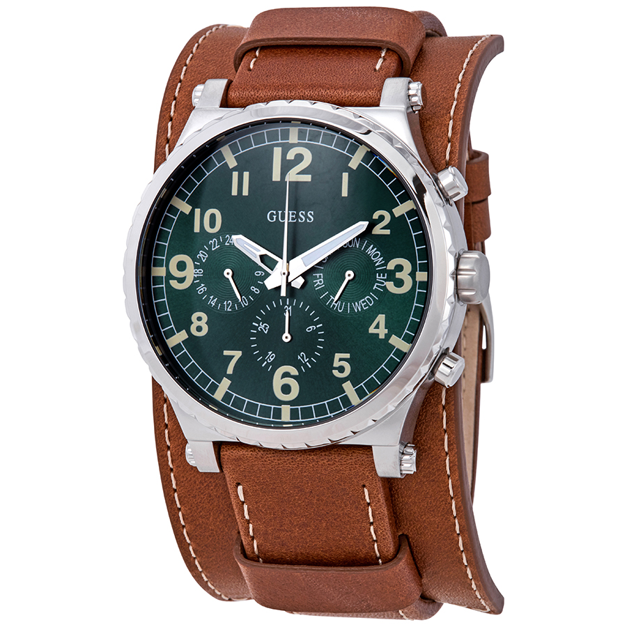 Silver-tone stainless steel case with a brown leather strap. Fixed silver-tone stainless steel bezel. Green dial with silver-tone hands and Arabic numeral hour markers. Minute markers around the outer rim. Dial Type: Analog. Luminescent hands. Three - day of the week, date and 24 hour subdials. Quartz movement. Scratch resistant mineral crystal. Screw down crown. Solid case back. Round case shape, case size: 46 mm, case thickness: 12 mm. Buckle clasp. Water resistant at 100 meters / 330 feet. Functions: date, day, hour, minute, second. Sport watch style. Guess Arrow Green Dial Mens Watch W1162G1.
