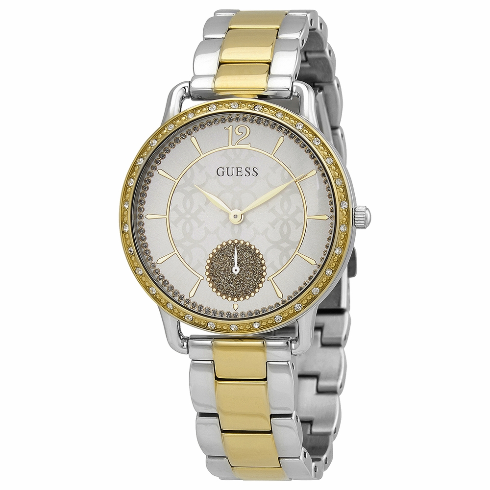 Silver-tone stainless steel case with a two-tone (silver-tone and gold-tone) stainless steel bracelet. Fixed gold-tone bezel with crystal set. White dial with gold-tone hands and index-Roman numeral hour markers. Roman numeral appear at the 12 o'clock position. Dial Type: Analog. One subdial displaying: small second. Quartz movement. Scratch resistant sapphire crystal. Pull / push crown. Solid case back. Round case shape, case size: 36 mm. Fold over clasp with a safety release. Water resistant at 30 meters / 100 feet. Functions: hour, minute, small second. Astral Series. Dress watch style. Watch label: Japan Movt. Guess Astral Quartz Crystal White Dial Ladies Watch U1290L1.