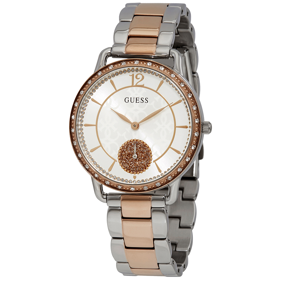 Silver-tone stainless steel case with a two-tone (silver-tone and rose gold-tone) stainless steel bracelet. Fixed rose gold-tone crystal set bezel. White dial with rose gold-tone hands and index hour markers. Dial Type: Analog. One - small second subdial. Quartz movement. Scratch resistant sapphire crystal. Pull / push crown. Solid case back. Round case shape, case size: 36 mm, case thickness: 9.65 mm. Band width: 16 mm. Fold over with safety release clasp. Water resistant at 30 meters / 100 feet. Functions: hour, minute, small second. Dress watch style. Watch label: Japan Movt. Guess Astral Quartz Crystal White Dial Two-Tone Ladies Watch W1290L2.