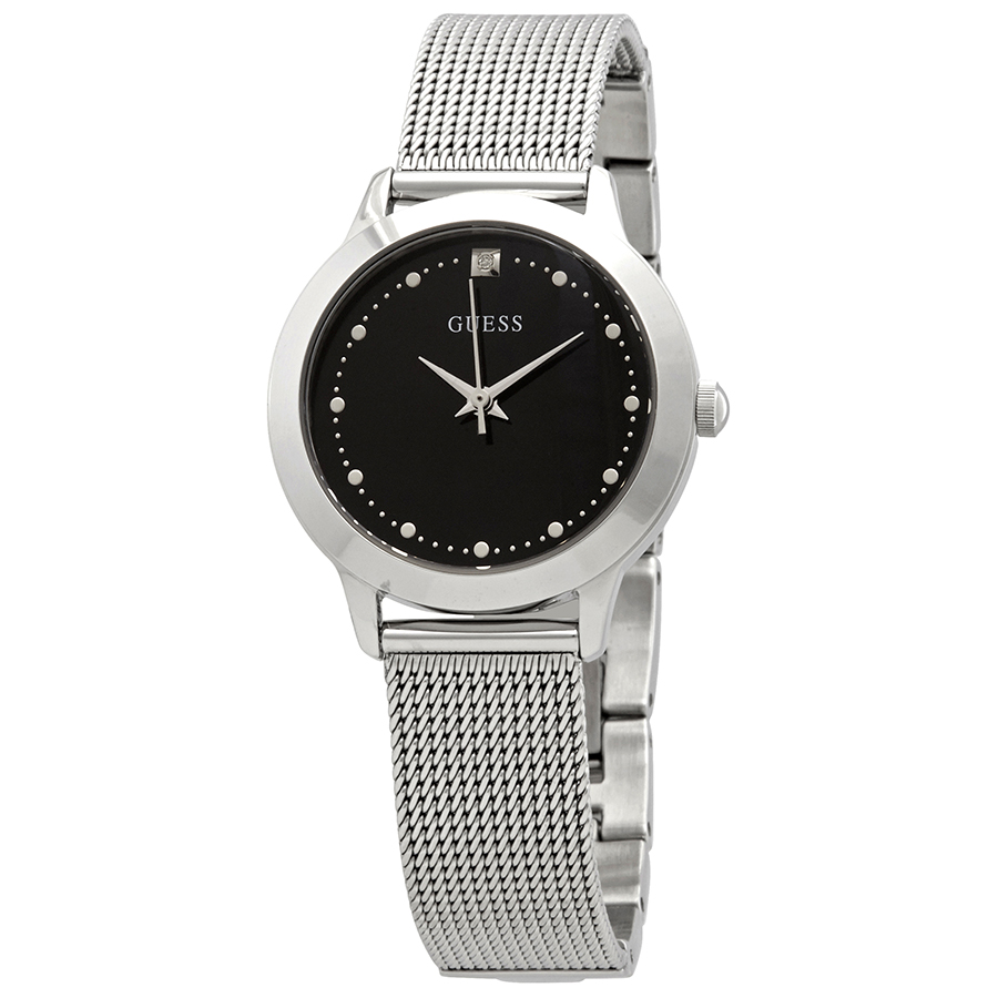 Stainless steel case with a stainless steel mesh bracelet. Fixed stainless steel bezel. Black dial with silver-tone hands and dot hour markers. A single diamond is set at the 12 o'clock position. Minute markers around the outer rim. Dial Type: Analog. Quartz movement. Scratch resistant mineral crystal. Pull / push crown. Solid case back. Round case shape. Case size: 30 mm. Case thickness: 8 mm. Band width: 14 mm. G-link clasp. Water resistant at 30 meters / 100 feet. Functions: hour, minute, second. Dress watch style. Guess Chelsea Quartz Black Dial Ladies Watch W1197L1.
