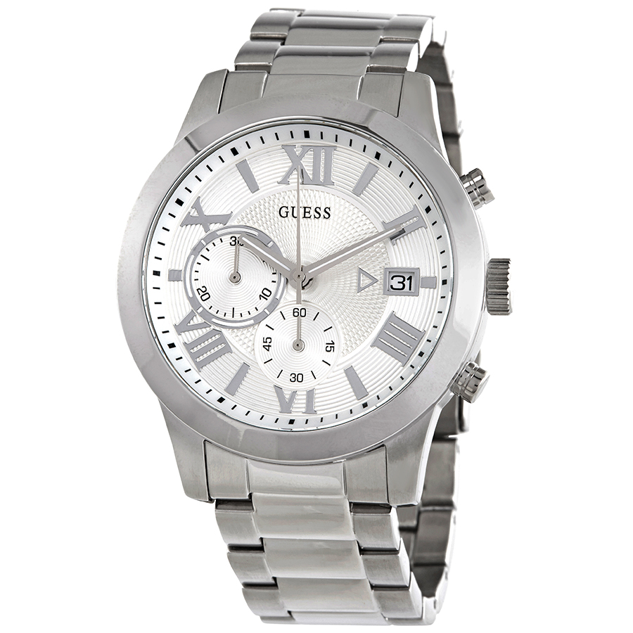 Stainless steel case with a stainless steel bracelet. Fixed stainless steel bezel. Silver dial with luminous silver-tone hands and alternating Roman numeral and index hour markers. Minute markers around the outer rim. Dial Type: Analog. Luminescent hands and markers. Date display at the 3 o'clock position. Chronograph - two sub-dials displaying: 60 second and 30 minute. Quartz movement. Scratch resistant mineral crystal. Pull / push crown. Solid case back. Round case shape. Case size: 44.5 mm. Case thickness: 12 mm. Band width: 22 mm. Fold over clasp with a safety release. Water resistant at 50 meters / 165 feet. Functions: chronograph, date, hour, minute, second. Casual watch style. Watch label: Japan Movt. Guess Classic Chronograph Silver Dial Mens Watch W0668G7.
