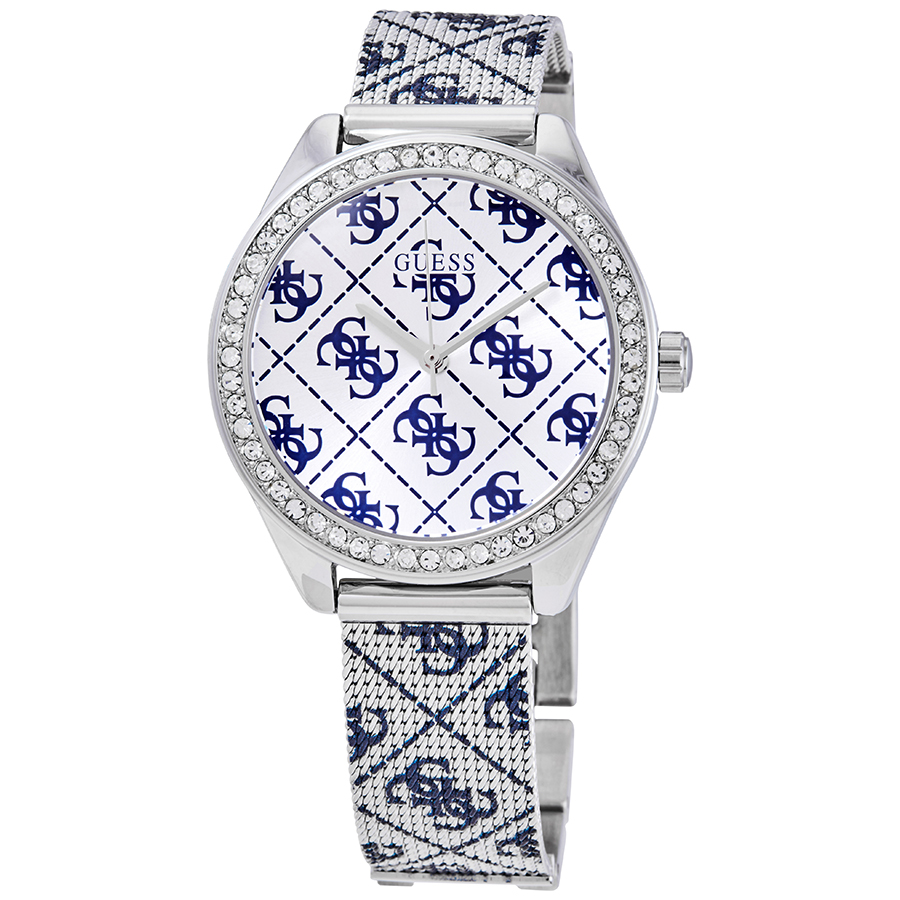 Silver-tone stainless steel case with a two-tone (silver-tone and blue) stainless steel mesh (guess logo) bracelet. Fixed silver-tone stainless steel set with crystals bezel. Silver (guess logo) dial with silver-tone hands. No markers. Dial Type: Analog. Quartz movement. Scratch resistant mineral crystal. Pull / push crown. Solid case back. Round case shape, case size: 36.5 mm, case thickness: 10.3 mm. Band width: 16 mm. Jewelry clasp. Water resistant at 10 meters / 33 feet. Functions: hour, minute, second. Claudia Series. Dress watch style. Watch label: Japan Movt. Guess Claudia Quartz Silver Dial Ladies Watch W1279L1.