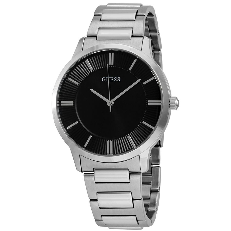 Stainless steel case with a stainless steel bracelet. Fixed stainless steel bezel. Black dial with silver-tone hands and index hour markers. Dial Type: Analog. Quartz movement. Scratch resistant mineral crystal. Pull / push crown. Solid case back. Round case shape. Case size: 44 mm. Case thickness: 10 mm. Band width: 20 mm. Deployment clasp with a push button release. Water resistant at 30 meters / 100 feet. Functions: hour, minute, second. Casual watch style. Watch label: Japan Movt. Guess Escrow Quartz Black Dial Mens Watch W0990G1.