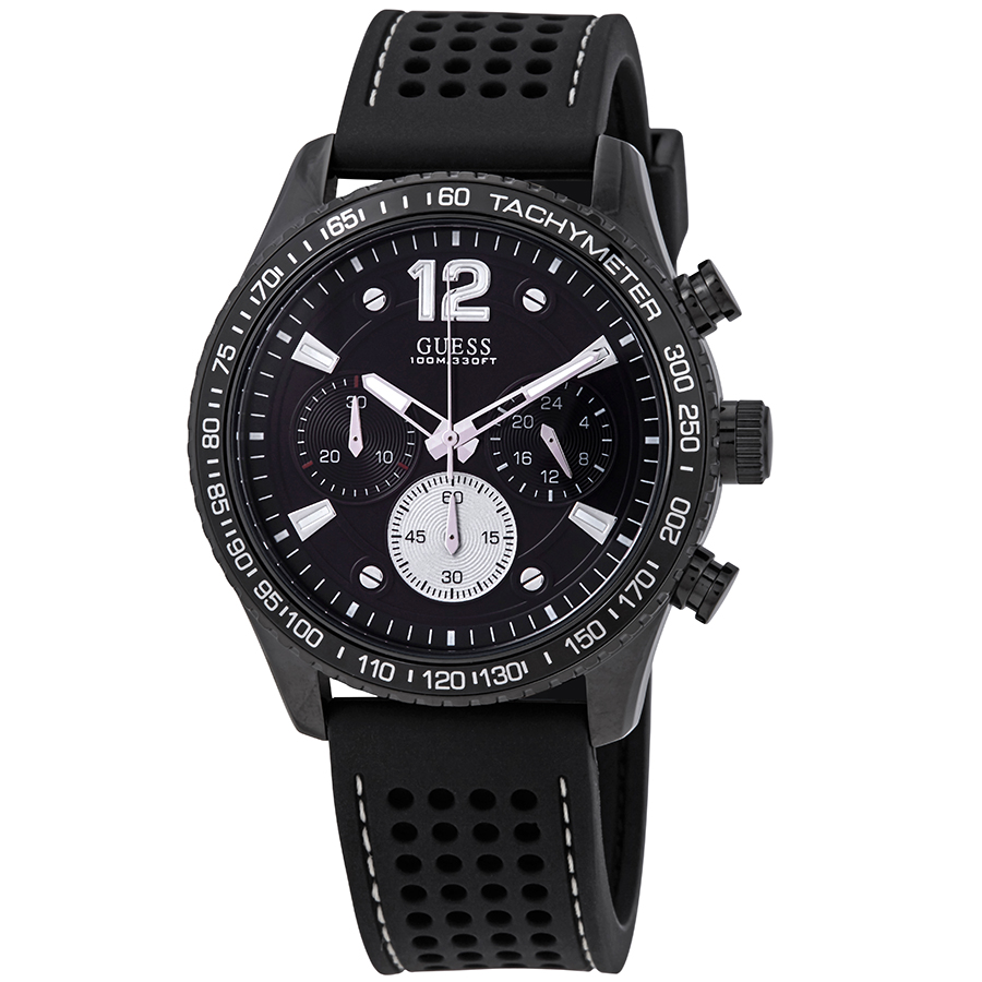 Black PVD stainless steel case with a black silicone strap. Fixed black PVD bezel with a black top ring showing tachymeter markings. White dial with luminous silver-tone hands and index hour markers. An Arabic numeral appears at the 12 o'clock position. Minute markers around the outer rim. Dial Type: Analog. Luminescent hands and markers. Chronograph - three sub-dials displaying: 60 second, 30 minute and 24 hour. Quartz movement. Scratch resistant mineral crystal. Pull / push crown. Solid case back. Round case shape. Case size: 44 mm. Case thickness: 12 mm. Band width: 22 mm. Tang clasp. Water resistant at 100 meters / 330 feet. Functions: chronograph, tachymeter, hour, minute, second. Sport watch style. Guess Fleet Chronograph Black Dial Black Silicone Mens Watch W0971G1