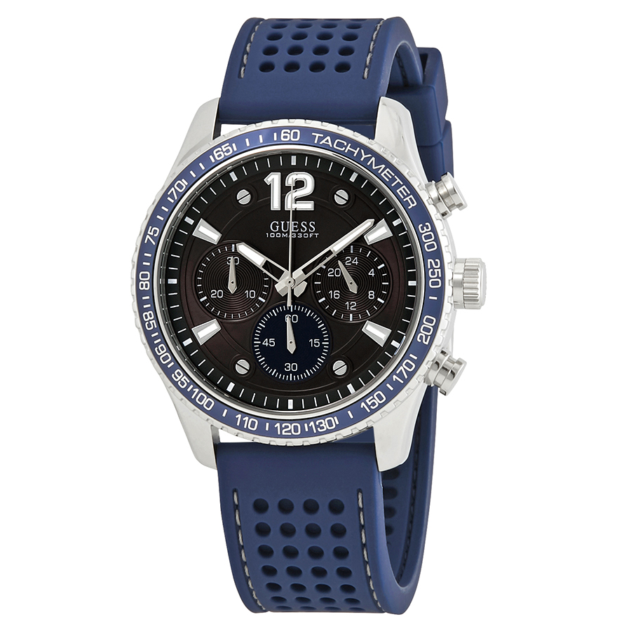 Silver-tone stainless steel case with a blue silicone strap. Fixed silver-tone stainless steel with a blue top ring bezel. Black dial with luminous silver-tone hands and index hour markers. Arabic numeral appears at the 12 o'clock position. minute markers around the outer rim. Dial Type: Analog. Luminescent hands and markers. Chronograph - three sub-dials displaying: 60 minutes, 30 seconds and 1/10th of a second. Quartz movement. Scratch resistant mineral crystal. Solid case back. Round case shape, case size: 44 mm, case thickness: 12 mm. Band width: 21 mm. Tang clasp. Water resistant at 100 meters / 330 feet. Functions: chronograph, tachymeter, hour, minute, second. Sport watch style. Guess Fleet Chronograph Black Dial Mens Watch W0971G2.