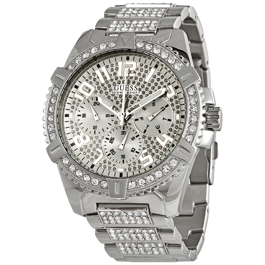 Stainless steel case with a stainless steel bracelet set with crystals. Fixed stainless steel bezel set with crystals. Silver dial with luminous silver-tone hands and Arabic numeral hour markers. Minute markers around the outer rim. Dial Type: Analog. Luminescent hands. Three multi-function sub-dials displaying: 24 hours, date and day of the week. Quartz movement. Scratch resistant mineral crystal. Pull / push crown. Solid case back. Round case shape. Case size: 48 mm. Case thickness: 13 mm. Band width: 22 mm. Deployment clasp with a push button release. Water resistant at 100 meters / 330 feet. Functions: date, day, hour, minute, second. Dress watch style. Guess Frontier Quartz Crystal Silver Dial Mens Watch W0799G1.