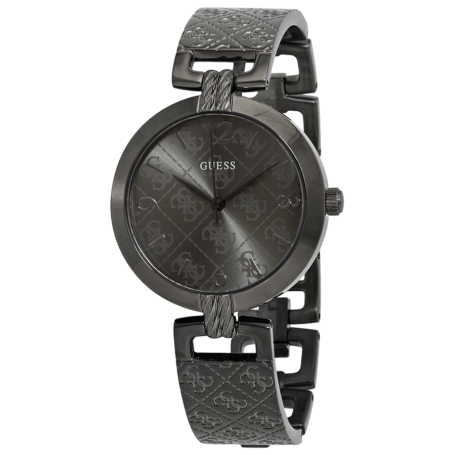 Gunmetal stainless steel case with a gunmetal stainless steel bangle bracelet. Fixed gunmetal bezel. Gunmetal sunray dial with gunmetal hands and index hour markers. Arabic numerals mark the 3, 6, 9 and 12 o'clock positions. Dial Type: Analog. Quartz movement. Scratch resistant mineral crystal. Pull / push crown. Solid case back. Round case shape. Case size: 35 mm. Case thickness: 8 mm. Band width: 16 mm. G-link clasp. Water resistant at 30 meters / 100 feet. Functions: hour, minute, second. Casual watch style. Watch label: Japan Movt. Guess G Luxe Quartz Ladies Gunmetal Watch W1228L4.