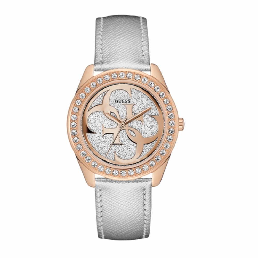 Rose gold-tone stainless steel case with a silver leather strap. Fixed rose gold-tone bezel set with zircons crystals. Silver (glitter) dial with rose gold-tone hands. No markers. Dial Type: Analog. Quartz movement. Scratch resistant mineral crystal. Screw down crown. Solid case back. Round case shape. Case size: 40 mm. Case thickness: 10 mm. Tang clasp. Water resistant at 30 meters / 100 feet. Functions: hour, minute, second. G Twist Series. Dress watch style. Guess G Twist Quartz Crystal Silver Dial Ladies Watch W0627L9.