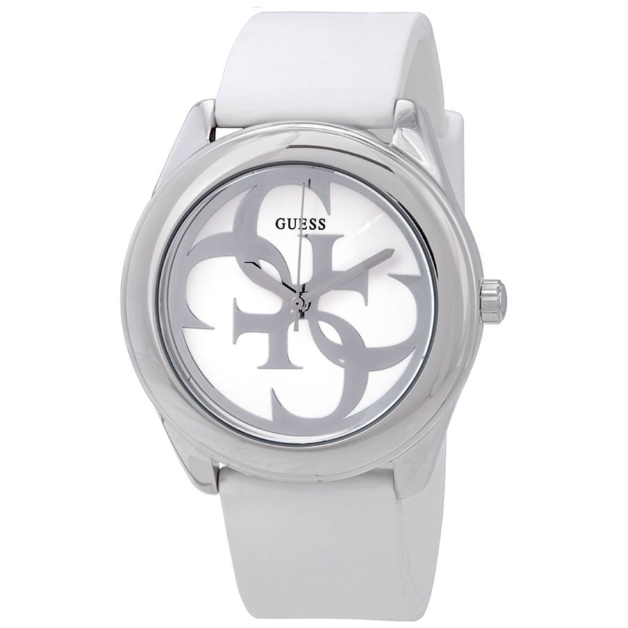 Stainless steel case with a white leather strap. Fixed stainless steel bezel. White dial with silver-tone hands. No markers. Dial Type: Analog. Quartz movement. Scratch resistant mineral crystal. Pull / push crown. Solid case back. Round case shape. Case size: 40 mm. Case thickness: 11 mm. Band width: 20 mm. Band length: 7 inches. Tang clasp. Water resistant at 30 meters / 100 feet. Functions: hour, minute, second. Dress watch style. Watch label: Japan Movt. Guess G-Twist White Dial White Leather Ladies Watch W0911L1.