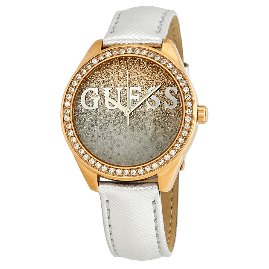 Rose gold PVD stainless steel case with a silver leather strap. Fixed rose gold PVD stainless steel set with crystals bezel. Rose and silver glitter dial with silver-tone hands. No markers. Dial Type: Analog. Quartz movement. Scratch resistant mineral crystal. Pull / push crown. Solid case back. Round case shape. Case size: 36 mm. Case thickness: 10 mm. Band width: 20 mm. Tang clasp. Water resistant at 30 meters / 100 feet. Functions: hour, minute, second. Dress watch style. Watch label: Japan Movt. Guess Glitter Girl Crystal Rose and Silver Glitter Dial Ladies Watch W0823L7.