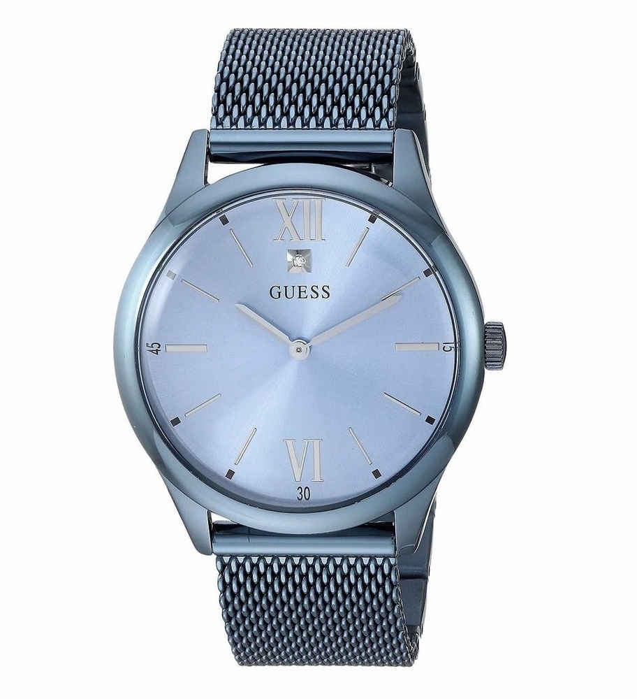 Sky blue ion-plated stainless steel case with a sky blue ion-plated stainless steel mesh bracelet. Fixed sky blue ion-plated bezel. Blue dial with silver-tone hands and index hour markers. A siongle diamond is set at the 12 o'clock position. Roman numeral markers appear at the 6 and 12 o'clock position. Dial Type: Analog. Quartz movement. Scratch resistant mineral crystal. Pull / push crown. Solid case back. Round case shape. Case size: 40 mm. Case thickness: 10 mm. Band width: 20 mm. Fold over clasp with a push button release. Water resistant at 10 meters. Functions: hour, minute. Holmes Series. Dress watch style. Guess Holmes Quartz Blue Diamond Sky Blue-plated Mesh Mens Watch U1214G4.