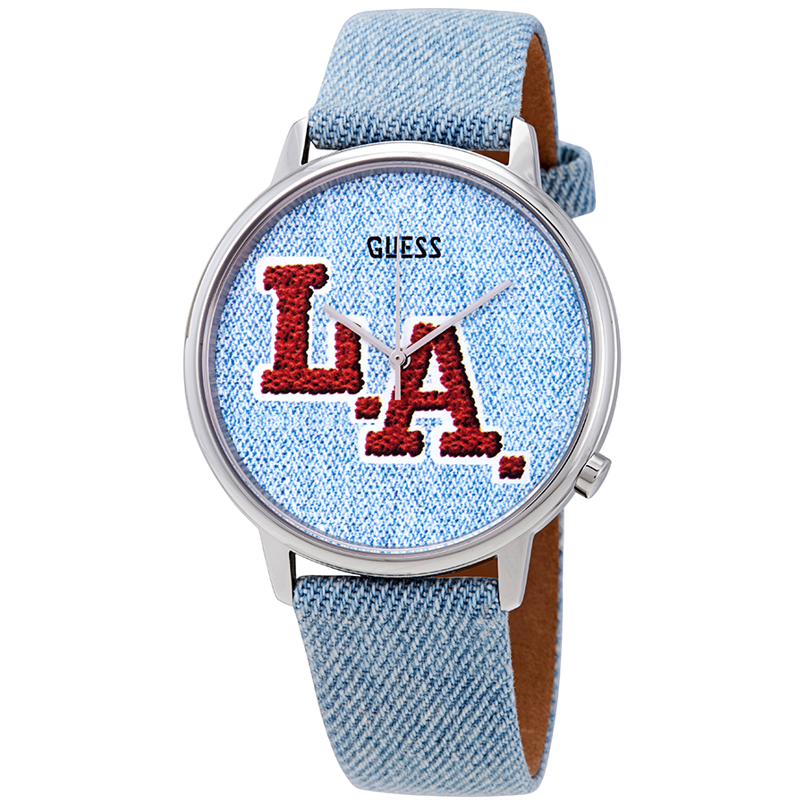 Stainless steel case with a blue leather/denim strap. Fixed stainless steel bezel. Denim dial with silver-tone hands. No markers. Dial Type: Analog. Quartz movement. Scratch resistant mineral crystal. Pull / push crown. Solid case back. Round case shape. Case size: 42 mm. Tang clasp. Water resistant at 30 meters / 100 feet. Functions: hour, minute, second. Guess L.A. Originals Denim Dial Watch V1011M1.