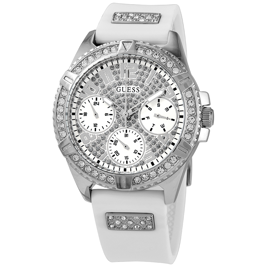 Silver-tone stainless steel case with a rubber silicone strap. Fixed silver-tone crystal set bezel. Silver-tone dial with silver-tone hands and Arabic numeral hour markers. Minute markers around the outer rim. Dial Type: Analog. Luminescent hands. Day and date subdials. Three - day, date & 24 hours subdials. Quartz movement. Scratch resistant mineral crystal. Pull / push crown. Solid case back. Round case shape, case size: 40 mm, case thickness: 12 mm. Band width: 20 mm. Buckle clasp. Water resistant at 50 meters / 165 feet. Functions: date, day, hour, minute, second, 24 hours. Dress watch style. Watch label: Japan Movt. Guess Lady Frontier Quartz Crystal Silver Dial Ladies Watch W1160L4.