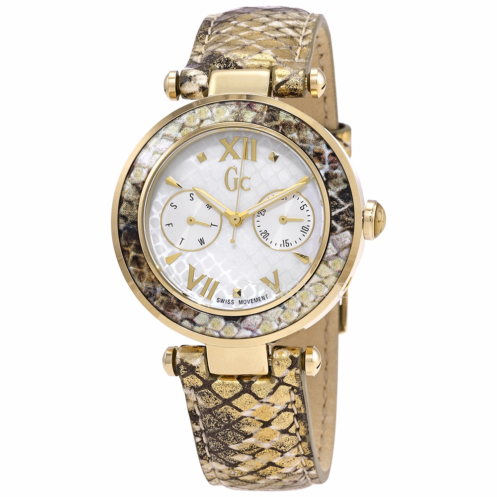 Gold-plated stainless steel case with a snakeskin-pattern leather strap. Fixed gold-plated bezel with an inlaid snakeskin-pattern ring. White dial with luminous gold-tone hands and index hour markers. Roman numerals appear at the 5, 7 and 12 o'clock positions. Dial Type: Analog. Luminescent hands. Two multi-function sub-dials displaying: day of the week and date. Quartz movement. Scratch resistant mineral crystal. Pull / push crown. Solid case back. Round case shape. Case size: 36 mm. Case thickness: 11 mm. Tang clasp. Water resistant at 30 meters / 100 feet. Functions: day, date, hour, minute, second. Ladychic Series. Casual watch style. Watch label: Swiss Made. Guess LadyChic Quartz White Dial Ladies Watch Y09003L1.