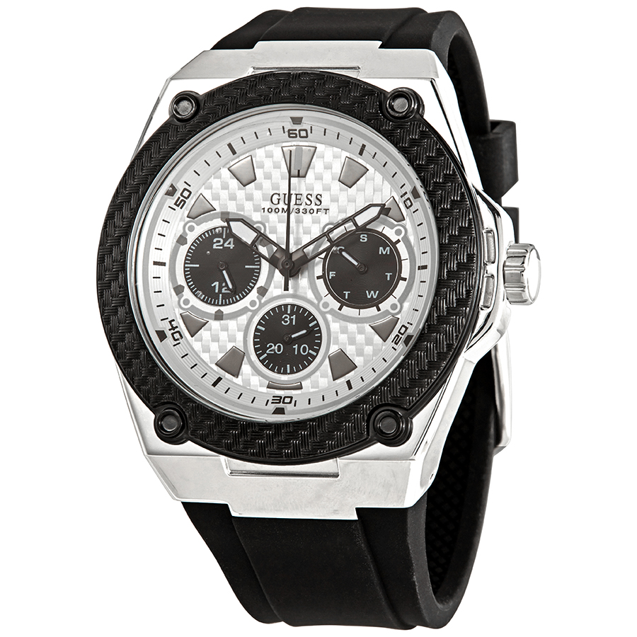 Stainless steel case with a black rubber strap. Fixed black bezel. White dial with luminous black hands and index hour markers. Minute markers around the outer rim. Dial Type: Analog. Luminescent hands and markers. Three black sub-dials displaying: 24 hours, date and day of the week. Quartz movement. Scratch resistant mineral crystal. Solid case back. Round case shape. Case size: 45 mm. Case thickness: 12 mm. Band width: 22 mm. Tang clasp. Water resistant at 100 meters / 330 feet. Functions: date, day, hour, minute, second. Casual watch style. Watch label: Japan Movt. Guess Legacy Quartz White Dial Black Rubber Mens Watch W1049G3.