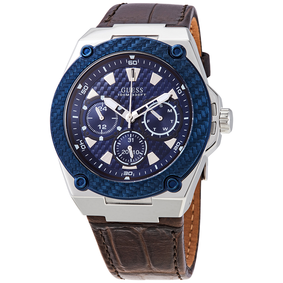 Silver-tone stainless steel case with a brown leather strap. Fixed blue bezel. Blue dial with silver-tone hands and index hour markers. Minute markers around the outer rim. Dial Type: Analog. Luminescent hands and markers. Date display at the 6 o'clock position. Quartz movement. Scratch resistant mineral crystal. Pull / push crown. Solid case back. Round case shape. Case size: 45 mm. Buckle clasp. Water resistant at 100 meters / 330 feet. Functions: date, day, hour, minute, second. Casual watch style. Watch label: Japan Movt. Guess Legacy Quartz Blue Dial Mens Watch W1058G4.