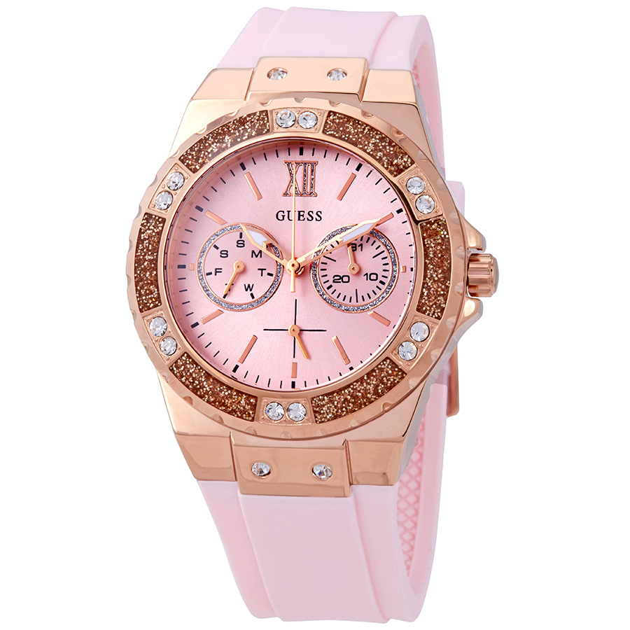 Rose gold-tone stainless steel case with a pink silicone strap. Fixed rose gold-tone bezel set with crystals. Pink dial with luminous rose gold-tone hands and index hour markers. A Roman numeral appears at the 12 o'clock position. Minute markers around the outer rim. Dial Type: Analog. Luminescent hands and markers. Three multi-function sub-dials displaying: date, day of the week and 24 hour. Quartz movement. Scratch resistant mineral crystal. Pull / push crown. Solid case back. Round case shape. Case size: 39 mm. Case thickness: 11.7 mm. Band width: 20 mm. Tang clasp. Water resistant at 50 meters / 165 feet. Functions: date, day, hour, minute, second. Limelight Series. Dress watch style. Watch label: Japan Movt. Guess Limelight Quartz Crystal Pink Dial Ladies Watch U1053L3.