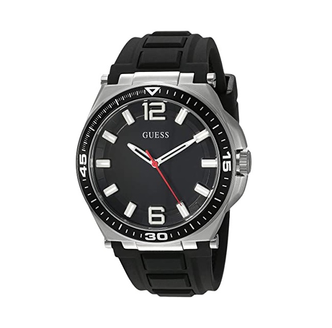 Stainless steel case with a black silicone strap. Fixed stainless steel bezel with black aluminum top ring. Black dial with luminous silver-tone hands and index hour markers. Arabic numeral markers appear at the 6 and 12 o'clock positions. Minute markers around the outer rim. Dial Type: Analog. Luminescent hands and markers. Quartz movement. Scratch resistant mineral crystal. Pull / push crown. Solid case back. Round case shape. Case size: 43 mm. Case thickness: 12 mm. Strap width: 21 mm. Tang clasp. Water resistant at 50 meters / 165 feet. Functions: hour, minute, second. Marlin Series. Sport watch style. Watch label: Japan Movt. Guess Marlin Quartz Black Dial Silicone Strap Mens Watch U1253G1.
