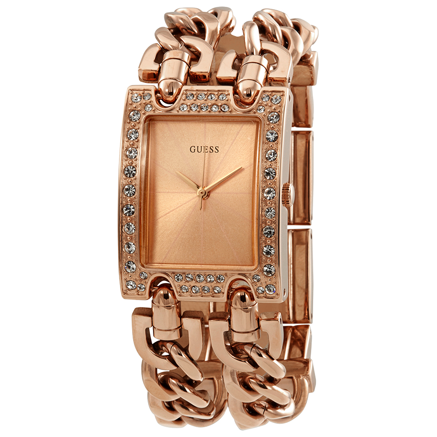 Rose gold-tone stainless steel case with a rose gold-tone stainless steel bracelet. Fixed- crystal set bezel. Rose gol-tone dial with rose gold-tone hands and index hour markers. Dial Type: Analog. Quartz movement. Pull / push crown. Solid case back. Rectangle case shape, case size: 28.5 mm x 39 mm, case thickness: 10 mm. Water resistant at 50 meters / 165 feet. Functions: hour, minute, second. Dress watch style. Guess Mod Heavy Ladies Rose Gold Tone Crystal Watch W1121L3.