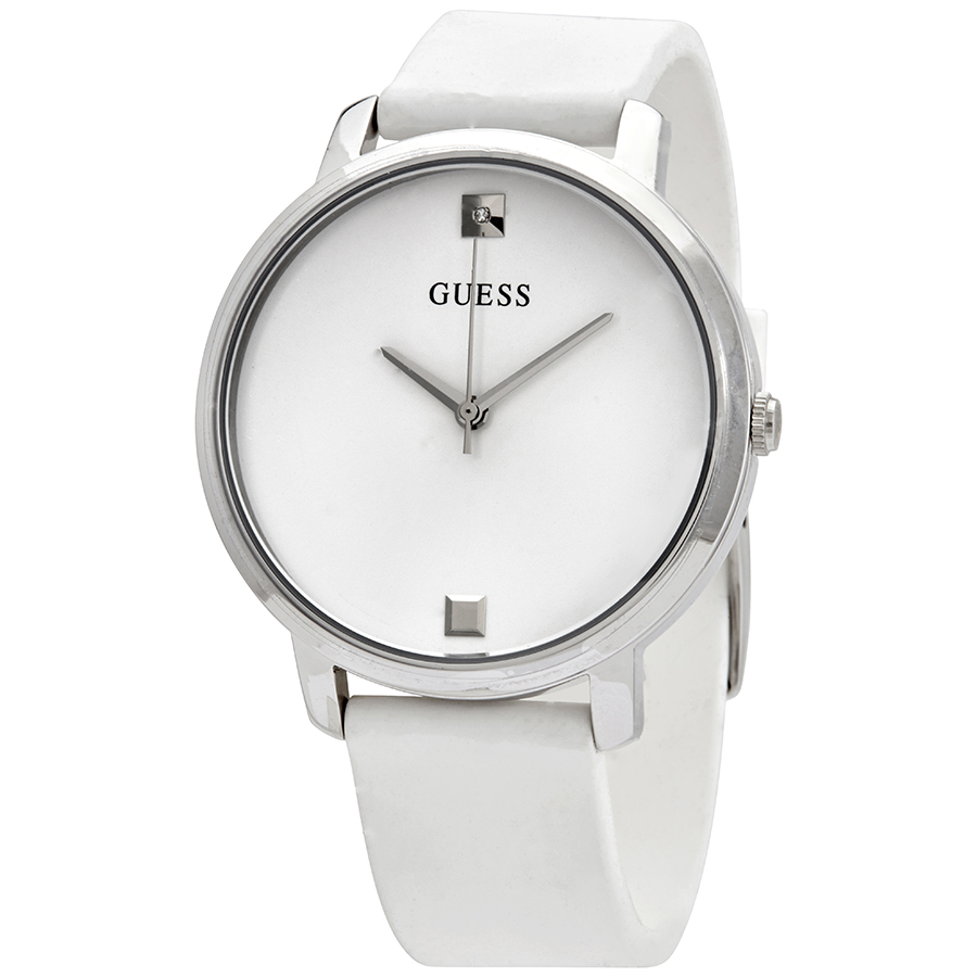 Stainless steel case with a white rubber strap. Fixed stainless steel bezel. Silver dial with silver-tone hands. A single diamond is set at the 12 o'clock position. Dial Type: Analog. Quartz movement. Scratch resistant mineral crystal. Pull / push crown. Solid case back. Round case shape. Case size: 40 mm. Case thickness: 9 mm. Band width: 18 mm. Tang clasp. Water resistant at 30 meters / 100 feet. Functions: hour, minute, second. Casual watch style. Guess Nova Quartz Silver Dial White Rubber Ladies Watch W1210L1.