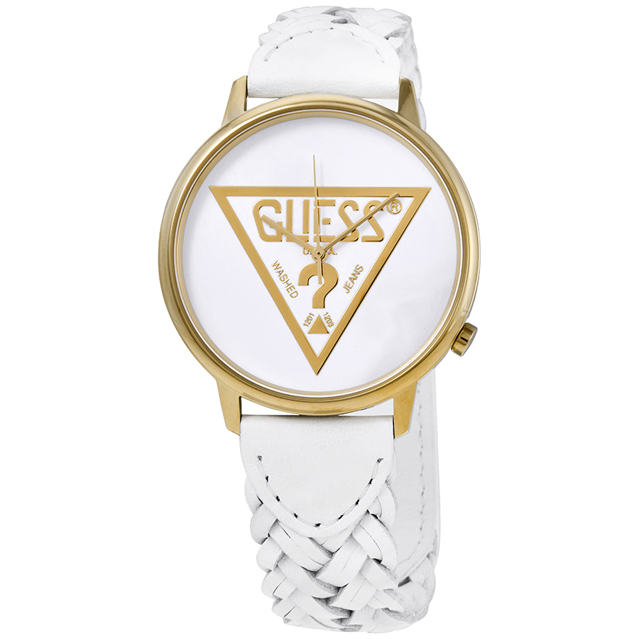 Yellow gold-tone stainless steel case with a white (briaded) leather strap. Fixed yellow gold-tone bezel. White (Guess logo) dial with yellow gold-tone hands. No markers. Dial Type: Analog. Quartz movement. Scratch resistant mineral crystal. Pull / push crown. Solid case back. Round case shape. Case size: 42 mm. Case thickness: 7 mm. Band width: 20 mm. Tang clasp. Water resistant at 30 meters / 100 feet. Functions: hour, minute, second. Casual watch style. Watch label: Japan Movt. Guess Originals Logo Quartz White Dial Ladies Watch V1001M4.