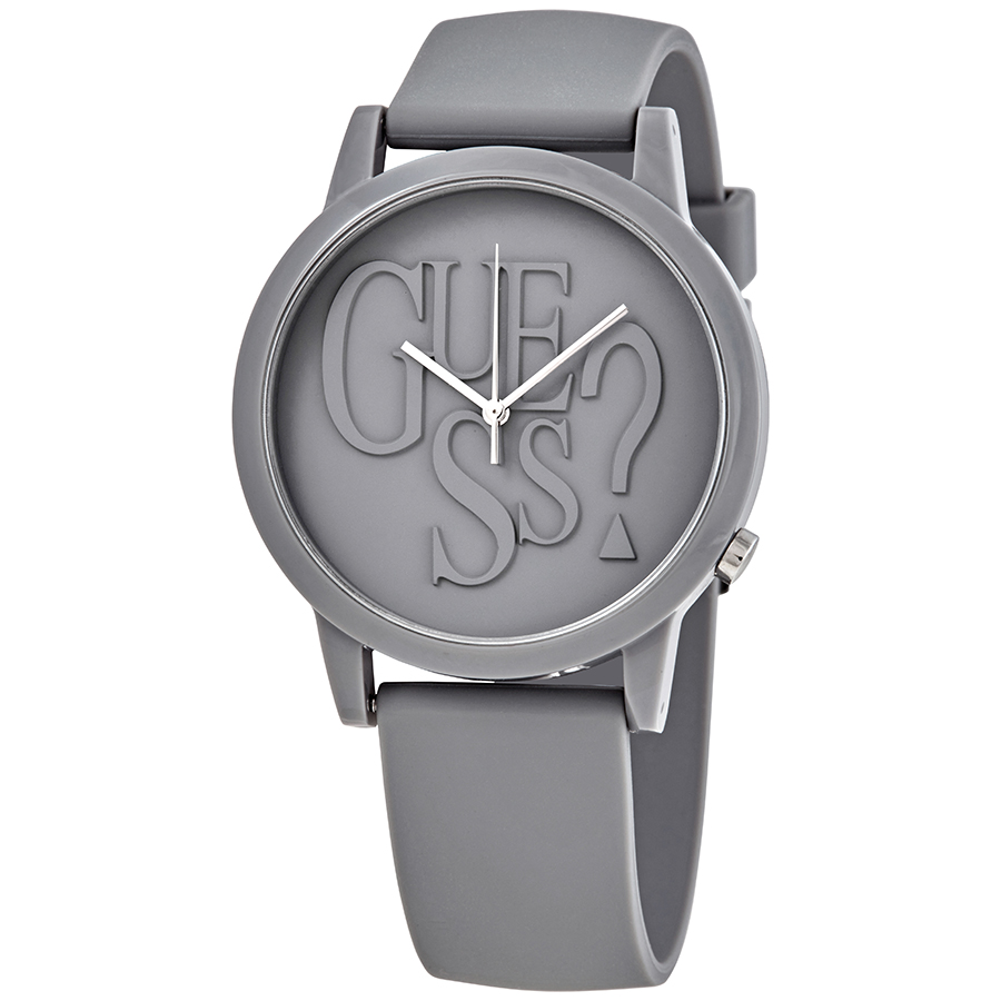 Grey plastic case with a grey silicone strap. Fixed grey plastic bezel. Grey dial with silver-tone hands. No markers. Dial Type: Analog. Quartz movement. Scratch resistant mineral crystal. Pull / push crown. Solid case back. Round case shape. Case size: 42 mm. Case thickness: 8.6 mm. Tang clasp. Water resistant at 30 meters / 100 feet. Functions: hour, minute, second. Casual watch style. Watch label: Japan Movt. Guess Originals Quartz Grey Dial Ladies Watch V1019M5.