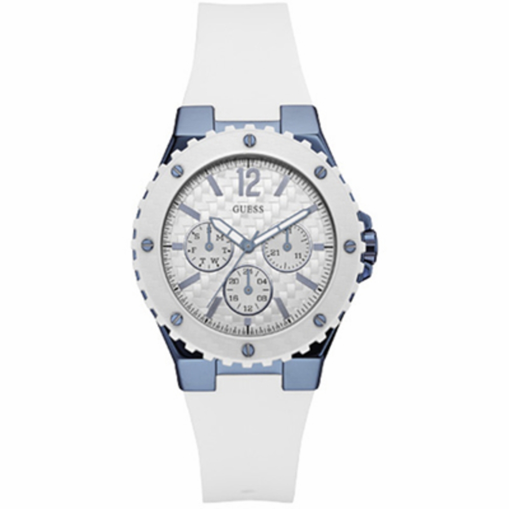 Blue-plated stainless steel case with a white silicone strap. Fixed white-plated bezel. White dial with luminous blue hands and index hour markers. An Arabic numeral appears at the 12 o'clock positions. Minute markers around the outer rim. Dial Type: Analog. Date display at the 3 o'clock position. Three multi-function sub-dials displaying: date, day of the week and 24 hour. Quartz movement. Scratch resistant mineral crystal. Pull / push crown. Solid case back. Round case shape. Case size: 39 mm. Case thickness: 10 mm. Band width: 23 mm. Tang clasp. Water resistant at 30 meters / 100 feet. Functions: date, day, hour, minute, second. Overdrive Series. Sport watch style. Guess Overdrive Quartz White Dial Ladies Watch W0149L6.