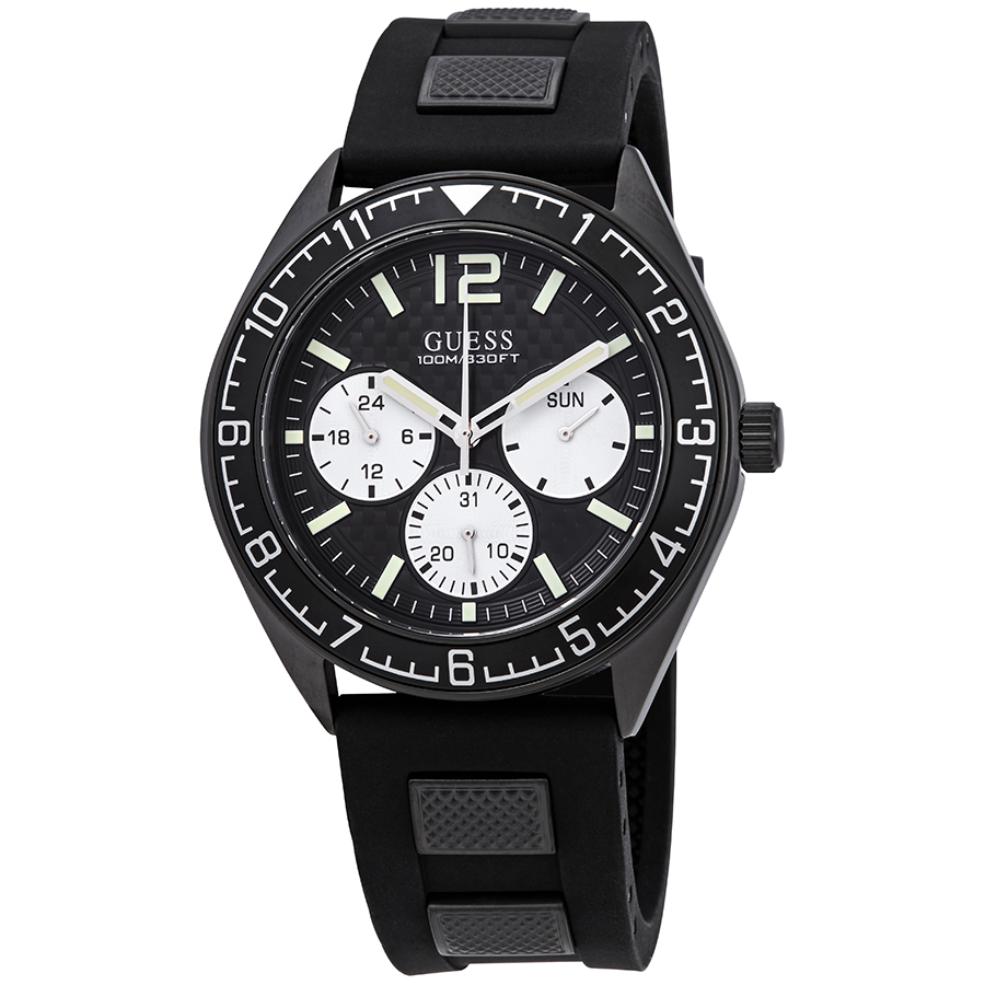 Black stainless steel case with a black silicone strap. Fixed black stainless steel bezel. Black dial with silver-tone hands and index-Arabic at the 12 o' clock hour markers. Minute markers around the outer rim. Dial Type: Analog. Luminescent hands and markers. Date display at the 6 o'clock position. Three - date, day of the week, 24 hours subdials. Quartz movement. Scratch resistant mineral crystal. Solid case back. Round case shape. Case size: 46 mm. Buckle clasp. Water resistant at 100 meters / 330 feet. Functions: date, day, hour, minute, second. Casual watch style. Watch label: Japan Movt. Guess Pacific Black Dial Mens Multifunction Watch W1167G2.