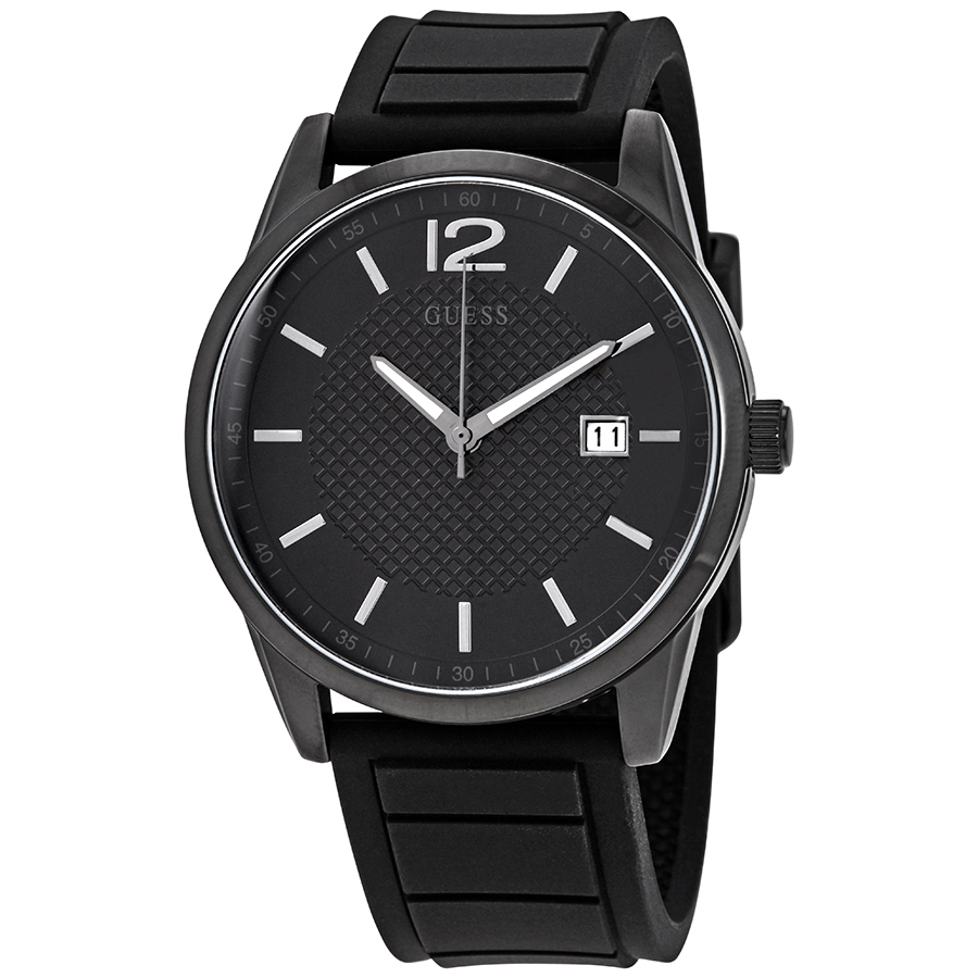 Black PVD stainless steel case with a black silicone strap. Fixed black PVD bezel. Black dial with luminous silver-tone hands and index hour markers. An Arabic numeral appears at the 12 o'clock position. Minute markers around the outer rim. Dial Type: Analog. Luminescent hands. Date display at the 3 o'clock position. Quartz movement. Scratch resistant mineral crystal. Pull / push crown. Solid case back. Round case shape. Case size: 42 mm. Case thickness: 11 mm. Band width: 22 mm. Tang clasp. Water resistant at 50 meters / 165 feet. Functions: date, hour, minute, second. Casual watch style. Guess Perry Black Dial Black Silicone Mens Watch W0991G3.