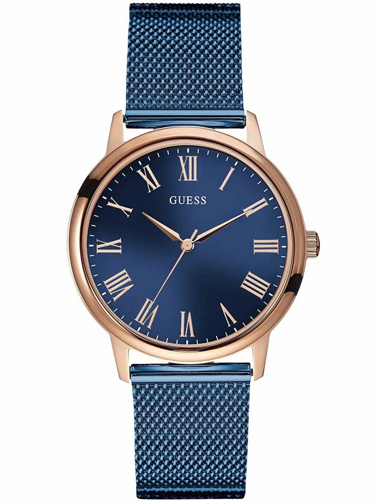 Rose gold-tone stainless steel case with a blue-plated stainless steel mesh bracelet. Fixed rose gold-tone bezel. Blue dial with rose gold-tone hands and Roman numeral hour markers. Minute markers around the outer rim. Dial Type: Analog. Quartz movement. Scratch resistant mineral crystal. Pull / push crown. Solid case back. Round case shape. Case size: 39 mm,. Case thickness: 9 mm. Band width: 18 mm. Fold over clasp. Water resistant at 30 meters / 100 feet. Functions: hour, minute, second. Casual watch style. Guess Quartz Blue Dial Blue-plated Mesh Band Mens Watch U0280G6.