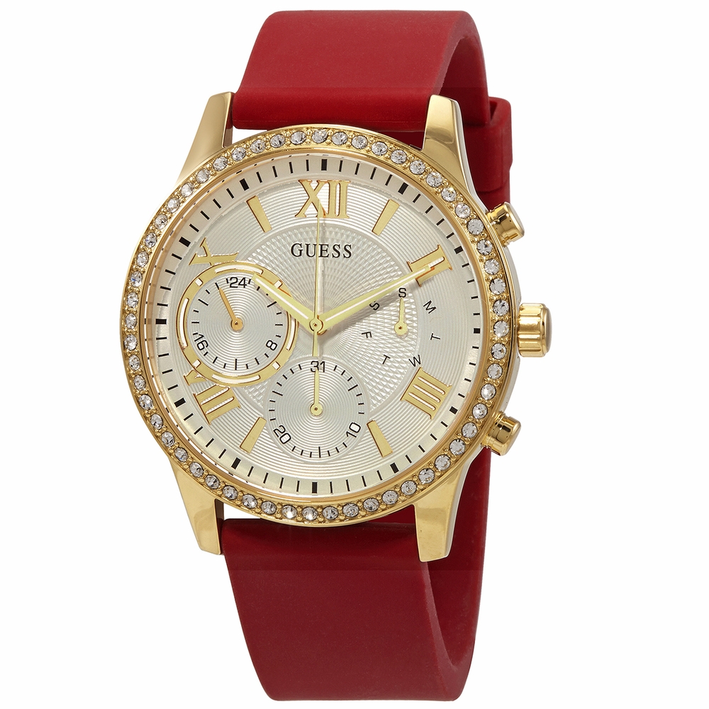 Gold-tone stainless steel case with a red silicone strap. Fixed gold-tone stainless steel- crysal set bezel. Silver dial with gold-tone hands and Roman numeral hour markers. Dial Type: Analog. Date display at the 6 o'clock position. Three sub-dials displaying: date, day of the week and 24 hours. Quartz movement. Scratch resistant mineral crystal. Pull / push crown. Solid case back. Round case shape, case size: 40 mm. Buckle clasp. Water resistant at 50 meters / 165 feet. Functions: date, day, hour, minute, second. Casual watch style. Guess Quartz Silver Dial Ladies Multifunction Watch U1135L6.