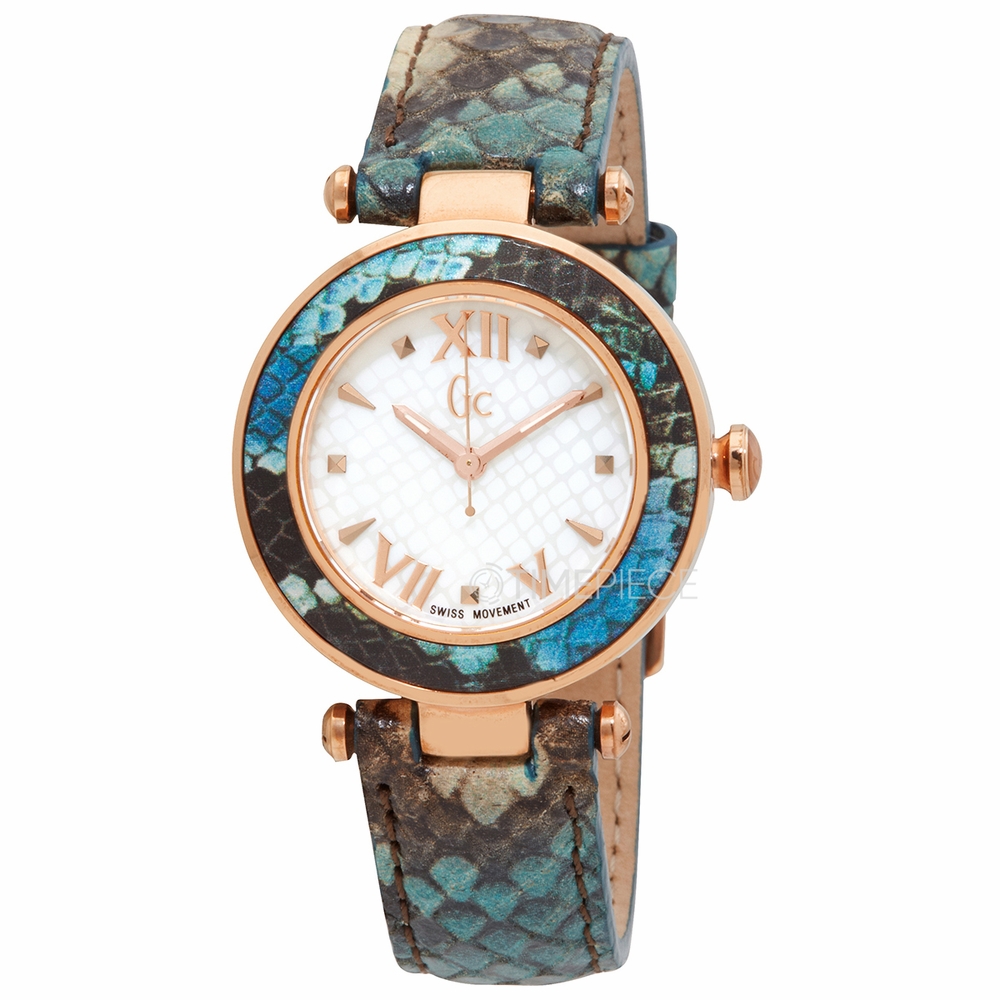 Rose gold-tone stainless steel case with a python pattern leather strap. Fixed rose gold-tone bezel with a python pattern inlay. White dial with rose gold-tone hands and index-Roman numeral hour markers. Roman numerals mark the 5, 7 and 12 o'clock positions. Dial Type: Analog. Quartz movement. Scratch resistant mineral crystal. Pull / push crown. Solid case back. Round case shape. Case size: 32 mm. Band width: 20 mm. Tang clasp. Water resistant at 50 meters / 165 feet. Functions: hour, minute, second. Casual watch style. Watch label: Swiss Made. Guess Quartz White Dial Ladies Watch Y10002L1.