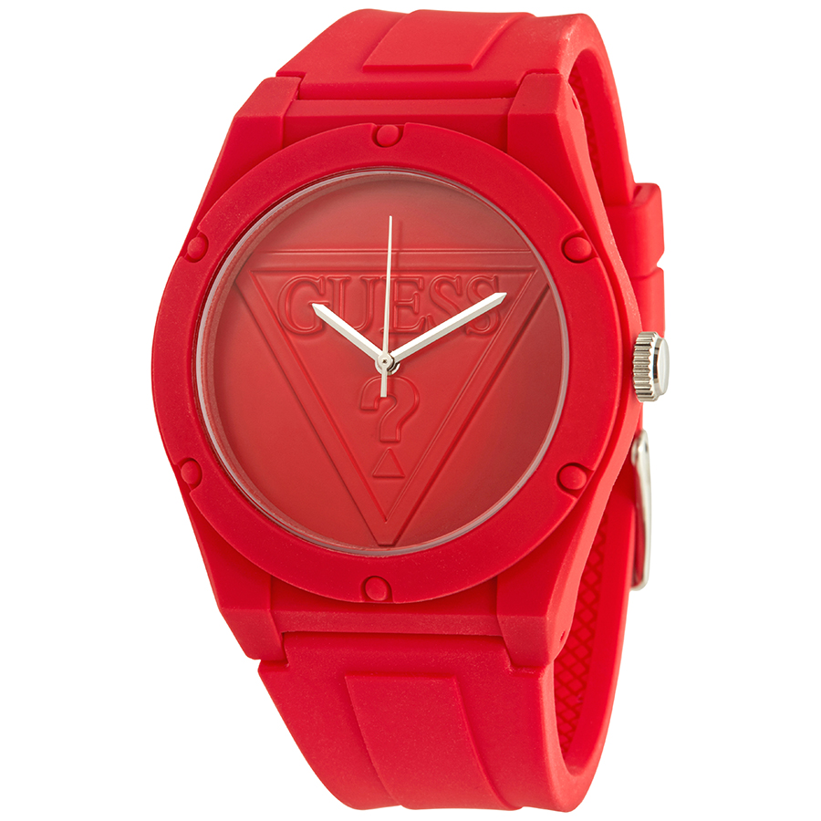 Red plastic case with a red silicone strap. Fixed red plastic bezel. Red (Guess logo) dial with silver-tone hands. No markers. Dial Type: Analog. Quartz movement. Scratch resistant mineral crystal. Pull / push crown. Solid case back. Round case shape. Case size: 42 mm. Case thickness: 11 mm. Band width: 20 mm. Tang clasp. Water resistant at 30 meters / 100 feet. Functions: hour, minute, second. Sport watch style. Watch label: Japan Movt. Guess Retro Pop Quartz Red Dial Red Silicone Watch W0979L3.