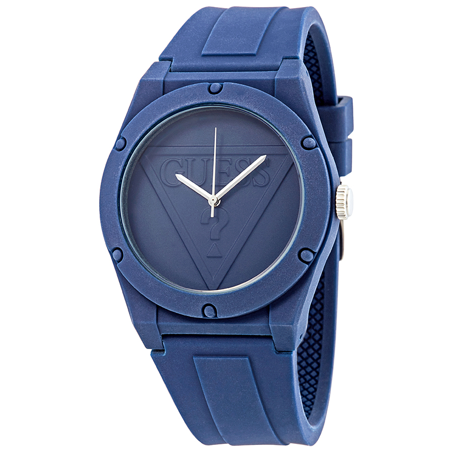 Navy plastic case with a navy silicone strap. Fixed navy plastic bezel. Navy (Guess logo) dial with silver-tone hands. No markers. Dial Type: Analog. Quartz movement. Scratch resistant mineral crystal. Pull / push crown. Solid case back. Round case shape. Case size: 42 mm. Case thickness: 10 mm. Band width: 20 mm. Tang clasp. Water resistant at 30 meters / 90 feet. Functions: hour, minute, second. Sport watch style. Watch label: Japan Movt. Guess Retro Pop Navy Blue Navy Silicone Mens Watch W0979L4.