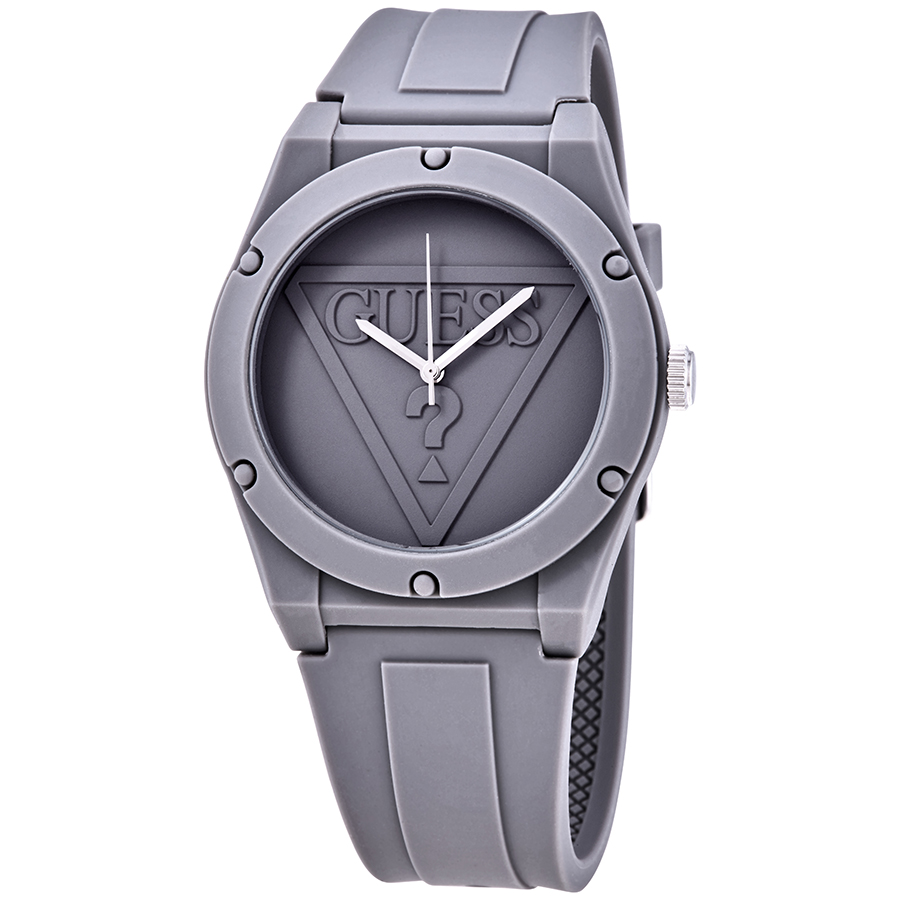Grey polycarbonate case with a grey silicone strap. Fixed grey polycarbonate bezel. Grey (Guess logo) dial with silver-tone hands. No markers. Dial Type: Analog. Quartz movement. Scratch resistant sapphire crystal. Pull / push crown. Solid case back. Round case shape. Case size: 42 mm. Case thickness: 10.90 mm. Band width: 20 mm. Tang clasp. Water resistant at 30 meters / 100 feet. Functions: hour, minute, second. Sport watch style. Watch label: Japan Movt. Guess Retro Pop Quartz Grey Dial Grey Silicone Ladies Watch W0979L7.