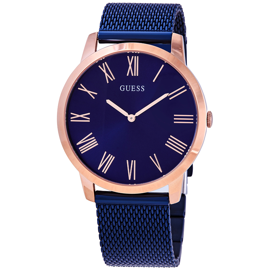Rose gold-tone stainless steel case and bracelet. Fixed rose gold-tone bezel. Blue dial with rose gold-tone hands and Roman numeral hour markers. Dial Type: Analog. Quartz movement. Scratch resistant mineral crystal. Pull / push crown. Solid case back. Round case shape. Case size: 44 mm. Case thickness: 9 mm. Fold over clasp with a push button release. Water resistant at 30 meters / 100 feet. Functions: hour, minute. Dress watch style. Watch label: Japan Movt. Guess Richmond Quartz Blue Dial Watch W1263G4.