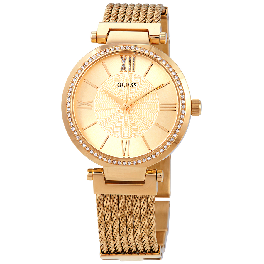 Yellow gold PVD stainless steel case with a yellow gold PVD stainless steel cable bracelet. Fixed yellow gold PVD bezel set with zircons crystals. Gold dial with yellow gold-tone hands and index hour markers. Roman numerals appear at the 3, 6, 9 and 12 o'clock positions. Dial Type: Analog. Quartz movement. Scratch resistant mineral crystal. Pull / push crown. Solid case back. Round case shape. Case size: 36.5 mm. Case thickness: 8.7 mm. Band width: 18 mm. Jewelry clasp. Water resistant at 30 meters / 100 feet. Functions: hour, minute, second. Dress watch style. Watch label: Japan Movt. Guess Soho Crystal Gold Dial Yellow Gold PVD Ladies Watch W0638L2.