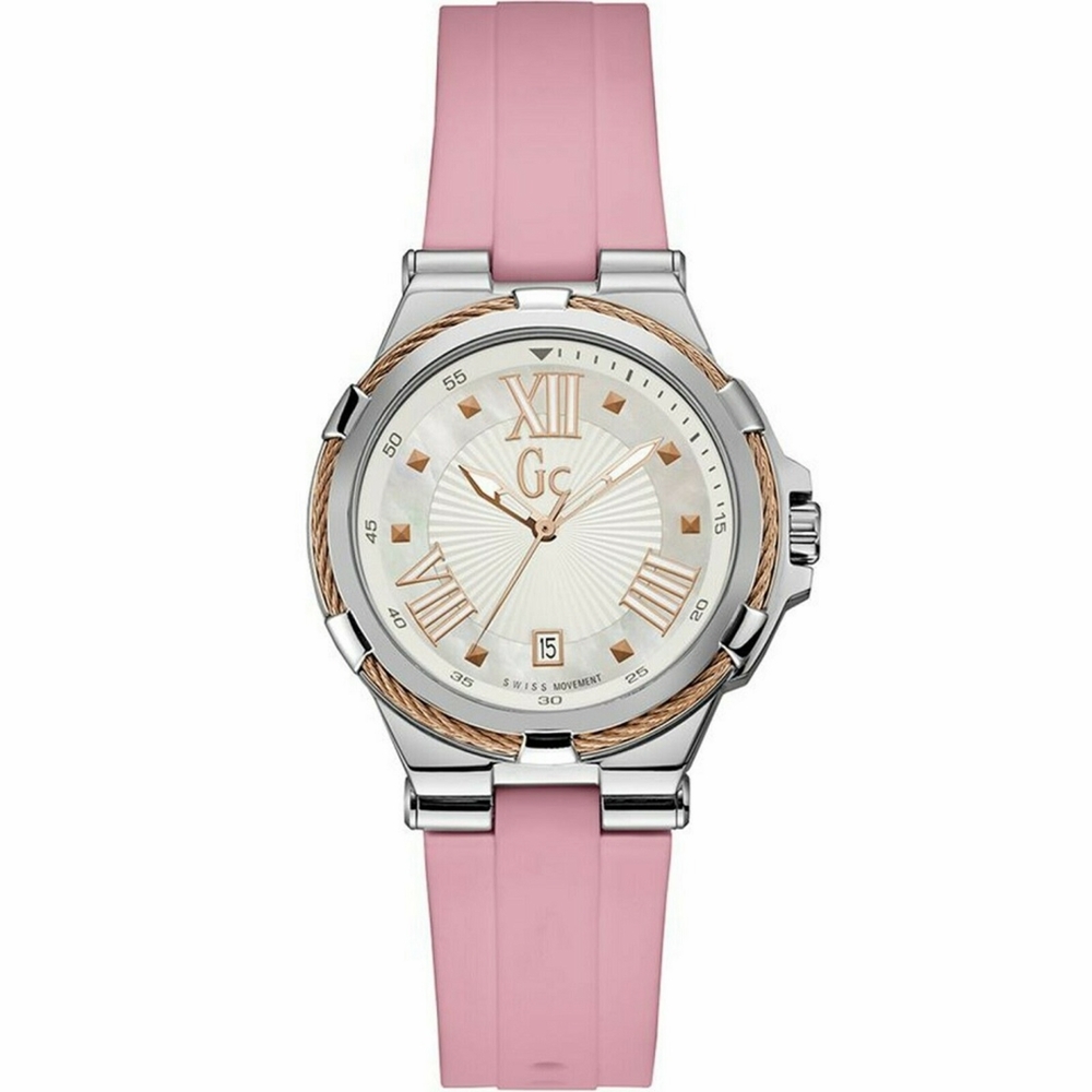 Stainless steel case with a pink silicone strap. Fixed stainless steel bezel with gold-tone cable wire trim. White mother of pearl dial with luminous rose gold-tone hands and pryamid hour markers. Roman numerals mark the 5, 7 and 12 o'clock positions. Arabic numeral minute markers (at 5 minute intervals). Dial Type: Analog. Luminescent hands and markers. Date display at the 6 o'clock position. Quartz movement. Scratch resistant mineral crystal. Pull / push crown. Solid case back. Round case shape. Case size: 36 mm. Case thickness: 10 mm. Tang clasp. Water resistant at 50 meters / 165 feet. Functions: date, hour, minute, second. Structura Cable Series. Casual watch style. Watch label: Swiss Mvt. Guess Structura Cable Quartz White Dial Ladies Watch Y34004L1.