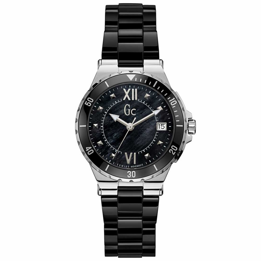 Stainless steel case with a black ceramic bracelet. Uni-directional rotating stainless steel bezel with an inlaid black ceramic ring. Black mother of pearl dial with luminous silver-tone hands and pyramid hour markers. Roman numerals appear at the 6 and 12 o'clock positions. Minute markers around the outer rim. Dial Type: Analog. Luminescent hands. Date display at the 3 o'clock position. Quartz movement. Scratch resistant mineral crystal. Pull / push crown. Solid case back. Round case shape. Case size: 36 mm. Case thickness: 9 mm. Fold over clasp with a push button release. Water resistant at 100 meters / 330 feet. Functions: date, hour, minute, second. Structura Lady Series. Sport watch style. Watch label: Swiss Made. Guess Structura Lady Quartz Black Mother of Pearl Dial Watch Y42002L2.