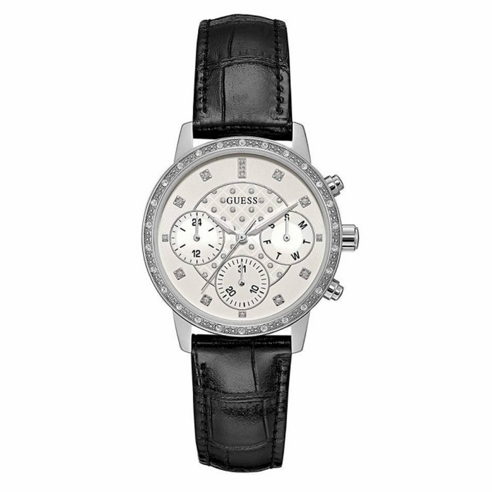 Stainless steel case with a black leather strap. Fixed stainless steel bezel set with crystals. White (crystal-set) dial with luminous silver-tone hands and crystal hour markers. Dial Type: Analog. Luminescent hands. Date display at the 6 o'clock position. Three multi-function sub-dials displaying: day of the week, date and 24 hour. Quartz movement. Scratch resistant mineral crystal. Pull / push crown. Solid case back. Round case shape. Case size: 37 mm. Case thickness: 7 mm. Band width: 18 mm. Tang clasp. Water resistant at 30 meters / 100 feet. Functions: date, day, hour, minute, second. Sunny Series. Dress watch style. Watch label: Swiss Mvt. Guess Sunny Quartz Crystal White Dial Ladies Watch W0957L2.