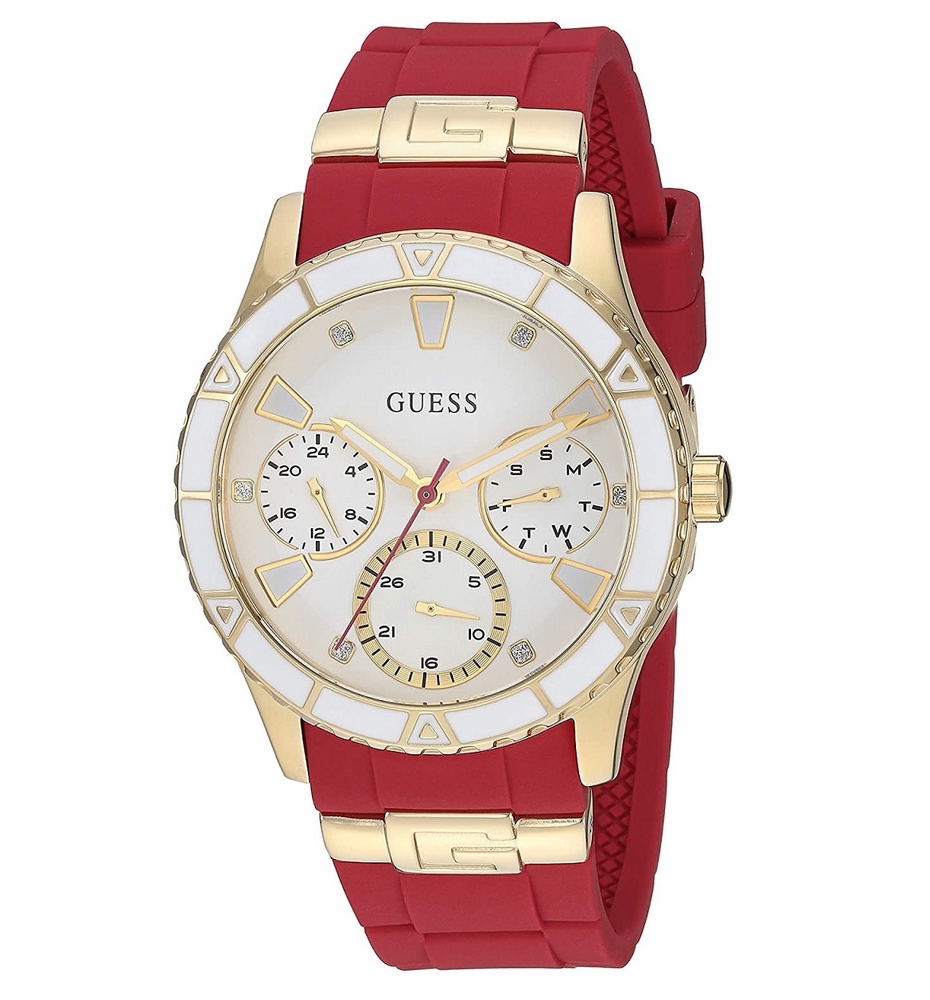 Yellow gold-tone stainless steel case with a red silicone strap. Fixed yellow gold-tone bezel with an inlaid white ring. White dial with luminous yellow gold-tone hands and alternating index and crystal hour markers. Dial Type: Analog. Luminescent hands and markers. Three sub-dials displaying: date, day of the week and 24 hour. Quartz movement. Scratch resistant mineral crystal. Pull / push crown. Solid case back. Round case shape. Case size: 38 mm. Case thickness: 11 mm. Band width: 20 mm. Tang clasp. Water resistant at 30 meters / 100 feet. Functions: date, day, hour, minute, second. Valencia Series. Dress watch style. Watch label: Japan Movt. Guess Valencia Multifunction Quartz Crystal White Dial Ladies Watch U1157L2.