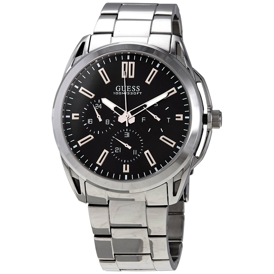 Stainless steel case with a stainless steel bracelet. Fixedstainless steel bezel. Black dial with luminous silver-tone hands and index hour markers. Minute markers around the outer rim. Dial Type: Analog. Luminescent hands. Date display at the 6 o'clock position. Three multi-function sub-dials displaying: day of the week, date and 24 hour. Quartz movement. Scratch resistant mineral crystal. Solid case back. Round case shape. Case size: 44 mm. Case thickness: 11 mm. Deployment clasp. Water resistant at 100 meters / 330 feet. Functions: date, day, GMT, second time zone, hour, minute, second. Vertex Series. Sport watch style. Watch label: Japan Movt. Guess Vertex Quartz Black Dial Stainless Steel Mens Watch U1176G2.
