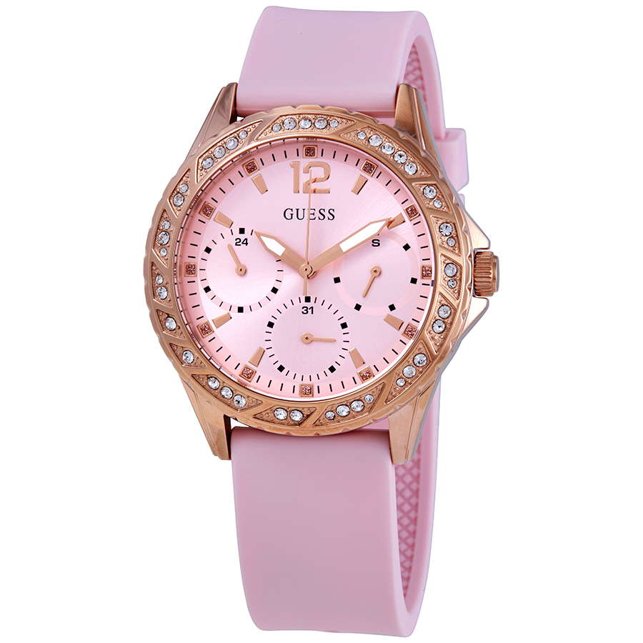 Rose gold-tone stainless steel case with a pink silicone strap. Fixed rose gold-tone bezel set with crystals. Pink dial with luminous rose gold-tone hands and index hour markers. An Arabic numeral appears at the 12 o'clock position. Minute markers around the outer rim. Dial Type: Analog. Luminescent hands. Date display at the 6 o'clock position. Three multi-function sub-dials displaying: date, day of the week and 24 hour. Quartz movement. Scratch resistant mineral crystal. Pull / push crown. Solid case back. Round case shape. Case size: 40 mm. Case thickness: 12 mm. Band width: 18 mm. Tang clasp. Water resistant at 30 meters / 100 feet. Functions: date, day, GMT, second time zone, hour, minute, second. Dress watch style. Watch label: Japan Movt. Guess Quartz Multifunction Pink Dial Ladies Watch W0032L9.