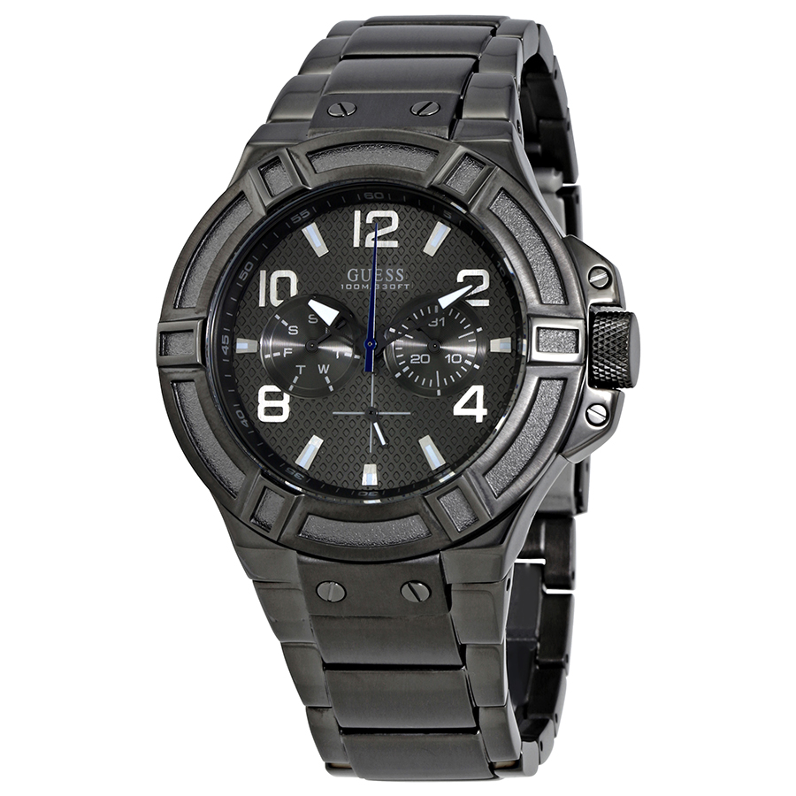 Grey ion-plated stainless steel case with a grey ion-plated stainless steel bracelet with black ion-plated center links. Fixed grey ion-plated stainless steel bezel. Grey dial with luminous black hands and alternating Arabic numeral and index hour markers. Minute markers around the outer rim. Dial Type: Analog. Luminescent hands and markers. Two sub-dials displaying: date and day of the week. Quartz movement. Scratch resistant mineral crystal. Solid case back. Case size: 46 mm. Case thickness: 10 mm. Round case shape. Band width: 27 mm. Fold over clasp. Water resistant at 100 meters / 330 feet. Functions: date, day, hour, minute, second. Casual watch style. Guess Rigor Multi-Function Grey Dial Mens Watch W0218G1.