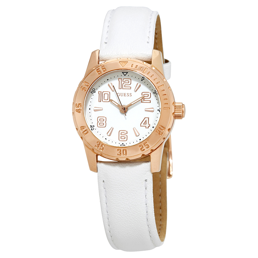 Rose gold-tone stainless steel case with a white leather strap. Fixed rose gold-tone stainless steel bezel. White dial with rose gold-tone hands and index-Arabic numerals hour markers. Minute markers around the outer rim. Dial Type: Analog. Quartz movement. Pull / push crown. Solid case back. Case size: 27 mm. Round case shape. Tang clasp. Water resistant at 30 meters / 100 feet. Functions: hour, minute, second. Dress watch style. Guess Montre White Dial Ladies Leather Watch W0545L1.