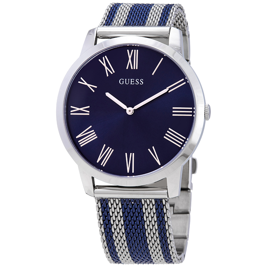 Silver-tone stainless steel case with a two-tone (silver-tone and blue) stainless steel mesh bracelet. Fixed bezel. Blue dial with silver-tone hands and Roman numeral hour markers. Dial Type: Analog. Quartz movement. Scratch resistant mineral crystal. Pull / push crown. Solid case back. Round case shape. Case size: 40 mm. Water resistant at 30 meters / 100 feet. Functions: hour, minute. Guess Blue Dial Mens Two Tone Mesh Watch W1179G1.