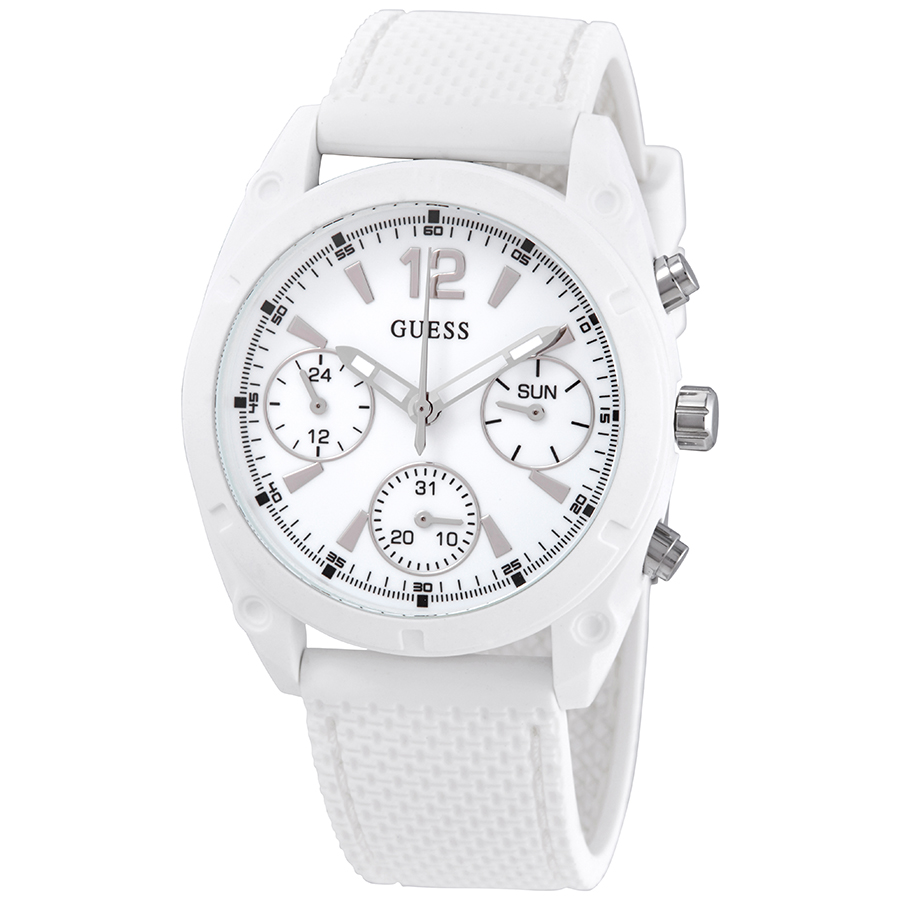 White polycarbonate case with a white silicone strap. Fixed white polycarbonate bezel. White dial with luminous silver-tone hands and index hour markers. An Arabic numeral appears at the 12 o'clock position. Minute markers around the outer rim. Dial Type: Analog. Luminescent hands. Date display at the 6 o'clock position. Three multi-function sub-dials displaying: date, day of the week and 24 hours. Quartz movement. Scratch resistant mineral crystal. Pull / push crown. Solid case back. Round case shape. Case size: 38 mm. Band width: 20 mm. Tang clasp. Water resistant at 30 meters / 100 feet. Functions: date, day, GMT, second time zone, hour, minute, second. Sport watch style. Watch label: Japan Movt. Guess Quartz White Dial Ladies Watch W1296L1.