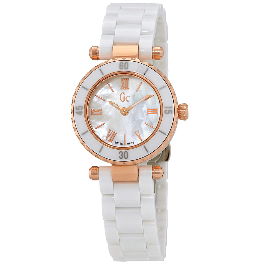 Rose gold-tone stainless steel and ceramic case with a white ceramic bracelet. Fixed white bezel. Mother of pearl dial with rose gold-tone hands and index-Roman numerals hour markers. Minute markers around the outer rim. Dial Type: Analog. Quartz movement. Scratch resistant sapphire crystal. Solid case back. Case size: 28 mm. Round case shape. Water resistant at 100 meters / 330 feet. Functions: hour, minute. Dress watch style. Watch label: Swiss Made. Guess Chic Mother of Pearl Dial Ladies Ceramic Watch X70011L1S.