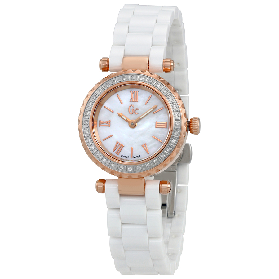 Rose gold-tone stainless steel case with a white ceramic bracelet. Fixed, crystal set rose gold-tone stainless steel bezel. White mother of pearl dial with rose gold-tone hands and index-Roman numeral hour markers. Dial Type: Analog. Quartz movement. Solid case back. Case size: 28 mm. Round case shape. Water resistant at 100 meters / 330 feet. Functions: hour, minute. Dress watch style. Watch label: Swiss Made. Guess Mini Chic White Mother of Pearl Dial Ladies Crystal Watch X70126L1S.